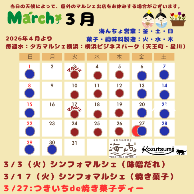 2026年3月の営業スケジュールをお知らせいたします。