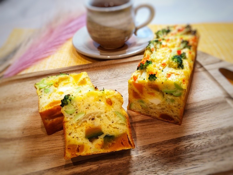 栄養バランスが良く、朝ごはんや軽食、おつまみにもなる甘くない野菜のパウンドケーキです。