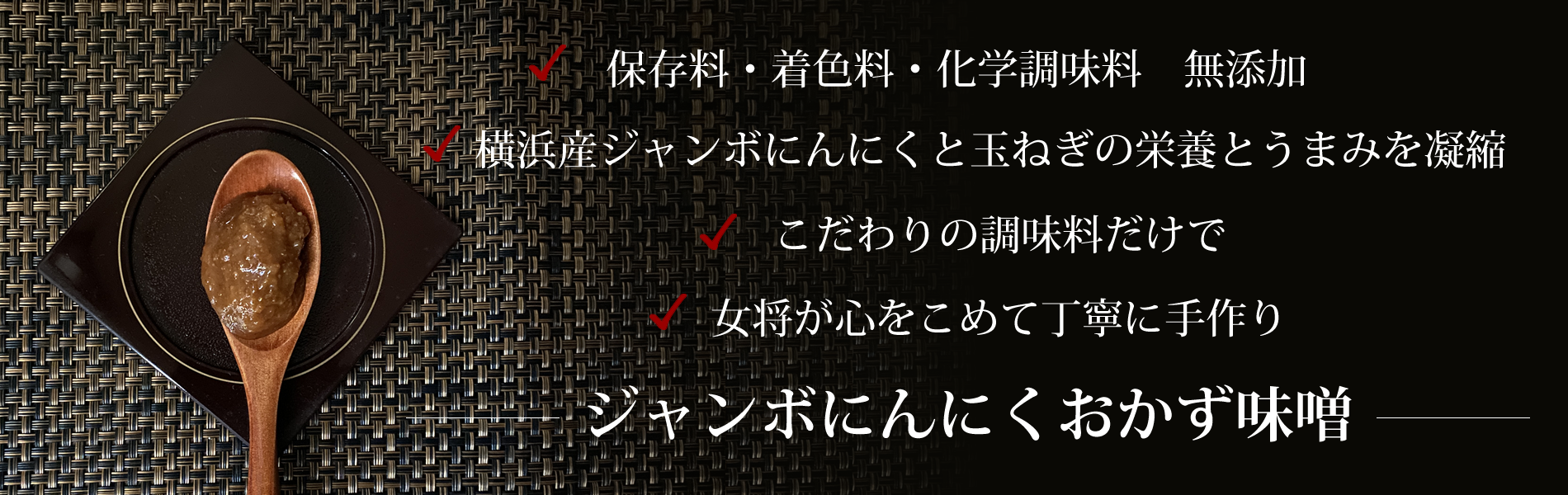 | 原材料名 | 無添加味噌、きび糖、ジャンボニンニク(国産・横浜産)、玉ねぎ(国産・横浜産)、純正白口胡麻油(岩井の胡麻油)、本みりん、酒 |