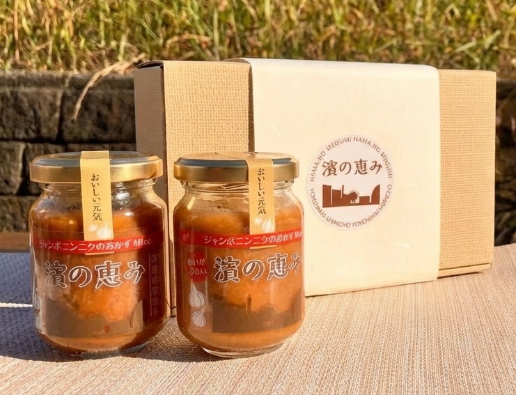 ジャンボにんにくおかず味噌だれ「濱の恵み」2個入りギフト用箱詰めセットです。大切な方に、「美味しく食べて、いつまでも元気でいてね。」そんな気持ちをこめて「濱の恵み」の【ジャンボにんにくおかず味噌だれ】「おいしい元気」ギフトを贈りませんか。