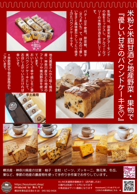 2022年2月、米粉と米麹甘酒と横浜野菜を使ったグルテンフリーの焼き菓子ブランド「Kozutsumiこづつみ」をスタート。